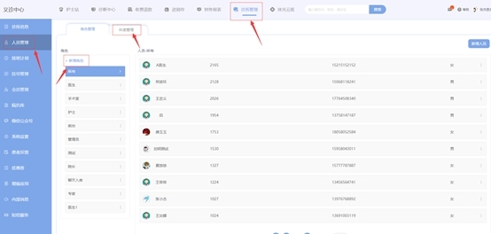 在使用叫号功能前,诊所要先对医生的科室进行设置。点击诊所管理-人员管理,添加医生,并分配医生科室,患者才可以根据叫号显示去相应的医生常驻诊室处就诊。