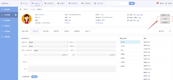 诊疗工单主要用于医生开具诊疗项目以后,患者进行诊疗项目进度的。例如:A患者需要做5次按摩,医生一次性开了5次按摩后,在诊疗工单可以看到A患者这笔工单,诊疗师完成一次诊疗后,点击完成,系统才会显示剩余4次未完成。