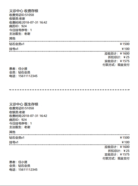 完成收费以后会自动弹出挂号收费小票。三联,收费凭证、收费存根,以及医生存根。
