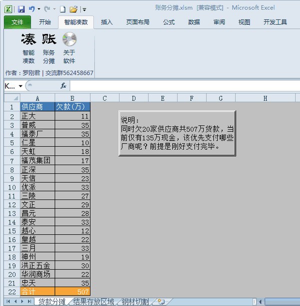 《智能凑数》包含智能凑数和账务分摊两个菜单,其中账务分摊的功能是将总金额智能地分摊到各个帐目明细中去。例如公司有200笔账款共10万元需要支付,而公司暂时只有6万现金不能一一支付完成。那么要如何找出200笔帐款中哪些账目金额的合计刚好等于6万呢?这是一个相当繁重的工作,人工查找显然效率太低。使用本工具可以瞬间完成,让你千百倍地提升工作效率。换言之,这是一个已知合计,要找出所有加数的过程,也可以称之为凑数----找出哪些数据刚好凑出指定的值。