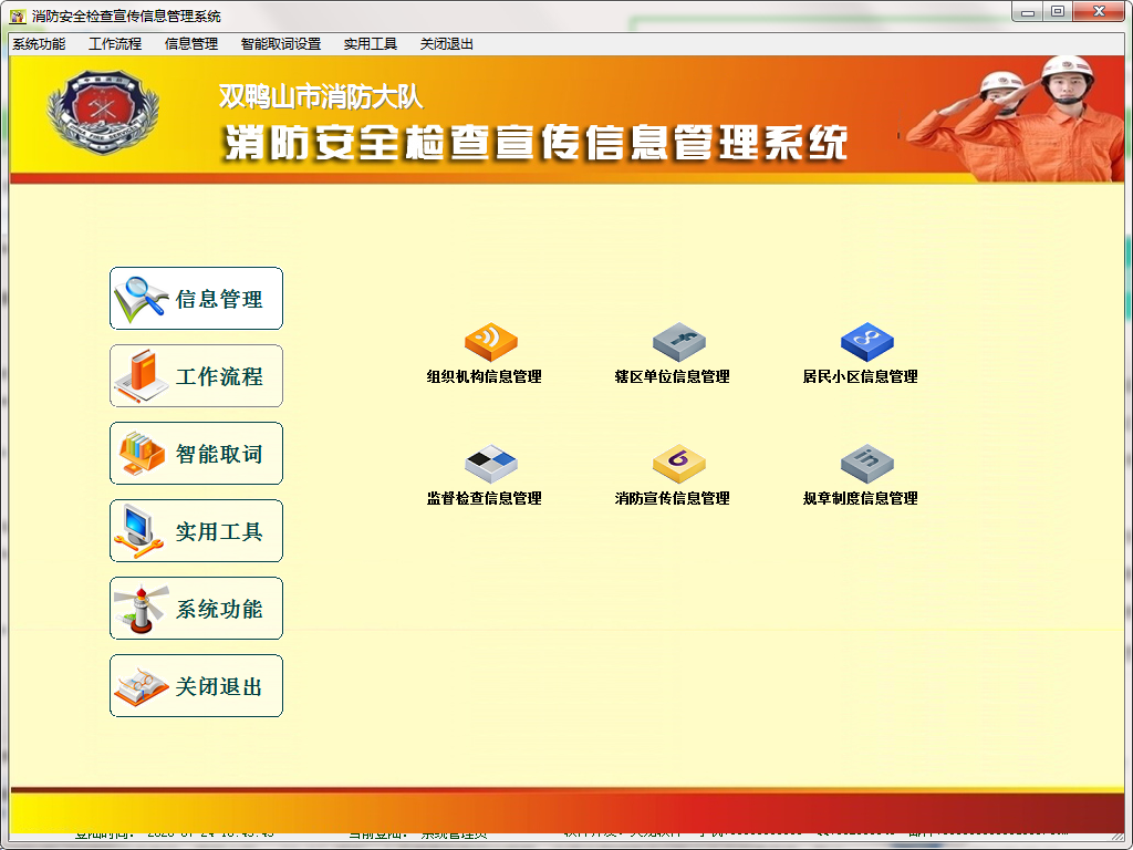 消防安全检查宣传信息管理系统最新版(消防检查记录表)适用于消防部门对辖区社会单位、居民小区、“九小”场所、人员密集的居民出租屋,市场内商铺等进行防火安全检查信息、防火安全宣传信息的管理。该系统最大特点就是简单适用、功能强大。用户无需具备很高的电脑知识,简单指点就可熟练使用本系统。