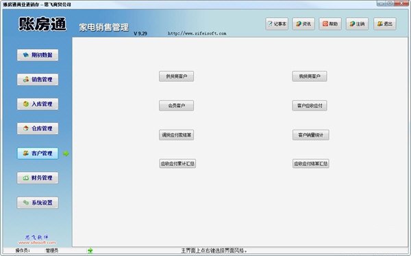 账房通家电销售管理电脑版是款专门应用于家电销售进行管理的工具,账房通家电销售管理电脑版拥有简洁的操作界面,丰富的功能,其软件是拥有强大的数据存储、查询和汇总功能。支持入库管理,仓库管理,客户管理,财务管理等。
