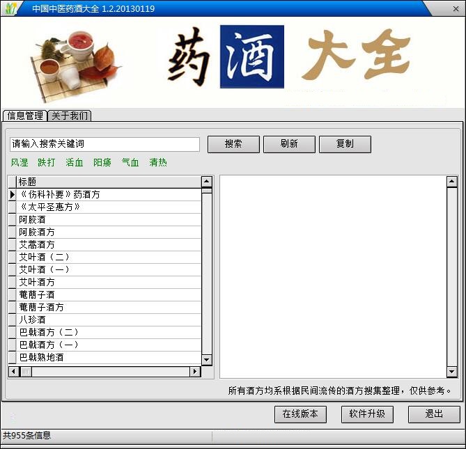 中国中医药酒大全精心选取了药酒良方950余条,内容完整,涉及面广,是每个家庭和医药工作者的必备软件。