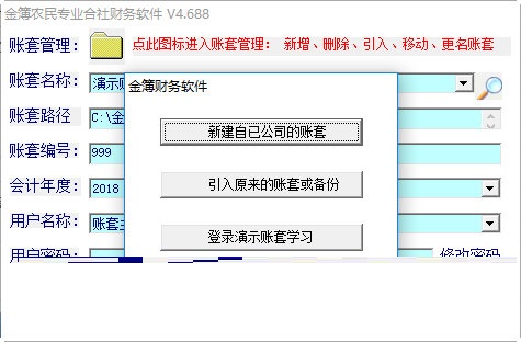 1、在登录窗口,点击最上面的黄色图标,输入密码9999,进入账套管理界面或直接点按钮新建自已公司的账套;