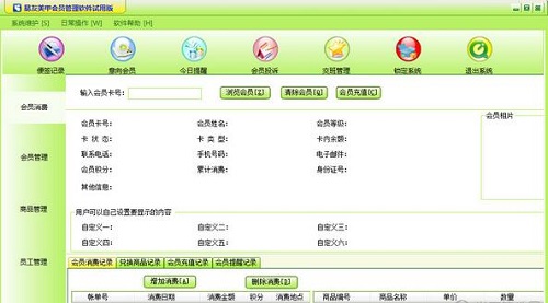 5、会员消费:该功能可以对会员刷卡登记和会员消费店内商品进行管理。同时也可以管理兑换商品、充值。