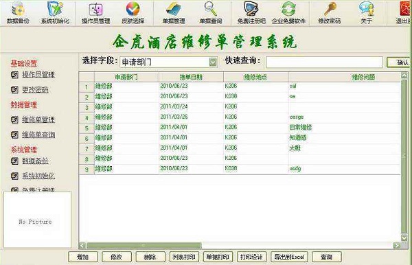 企虎酒店维修单管理软件最新版是一款基于酒店维修单据提供的管理软件。企虎酒店维修单管理软件最新版可以记录酒店内部设施的损坏状况,与维修部对接,实行维修计划,计算出维修成本,制作成维修单据,用户可以自定义修改与删除维修单据。软件还可以随时备份系统中的重要数据。