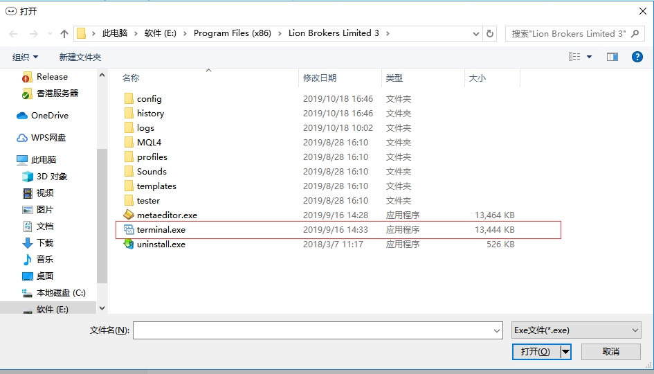 ②点击“打开平台程序”,找到MT4安装目录下的terminal.exe,或者MT5安装目录下的terminal64.exe,点击打开;