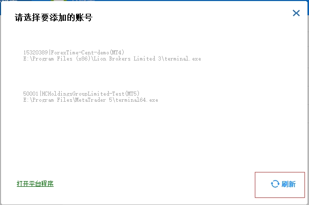③等待MT4或者MT5启动后,点击“刷新”按钮,在选择列表中,选择要跟单的信号源或者复制者账号,确认添加;