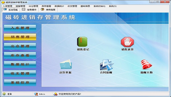 1、入库登记、销售登记、销售退货、打印送货单据;