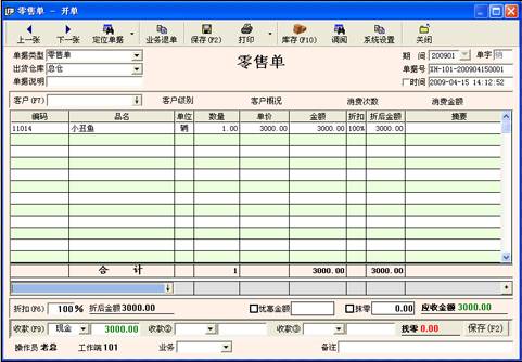 本模块在“销售管理”的“销售开单”,在此实现商品的销售功能。可以选择客户,并有多种收款方式提供选择,保存后支持票据打印,并提供多种打印样式。销售后在相应的报表中都能够查到所有的销售信息。