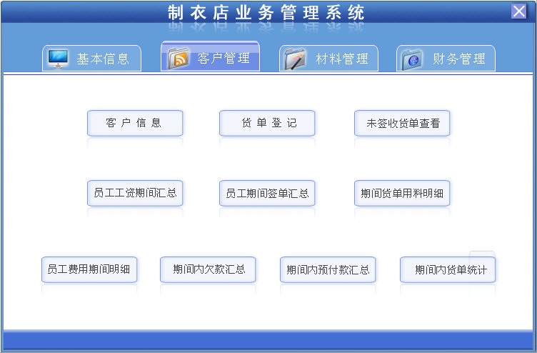 3、客户管理主要包括:客户信息、货单登记、未签收货单查看、员工工资期间汇总、员工期间签单汇总、期间货单用料明细、员工费用期间明细、期间内欠款汇总、期间内预付款汇总、期间内货单统计十部分。