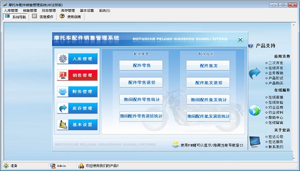 宏达摩托车配件销售管理系统官方版是一款功能全面、上手非常容易操作的且专为中小型摩托车配件销售管理工具,宏达摩托车配件销售管理系统官方版内置丰富功能,其软件主要包括入库管理、销售管理、财务管理、库存管理和基本设置五大功能模块,相当实用。