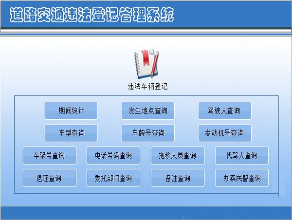 2、统计汇总:期间统计、发生地点查询、驾驶人查询、车型查询、车牌号查询、发动机号查询、车架号查询、电话号码查询、拖移人员查询、代驾人查询、退还查询、委托部门查询、办案民警查询、备注查询。