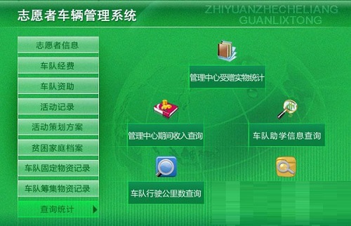 9、查询统计:管理中心受赠实物统计、管理中心期间收入统计、车队助学信息查询、车队行驶公里数查询、个人行驶公里数查询
