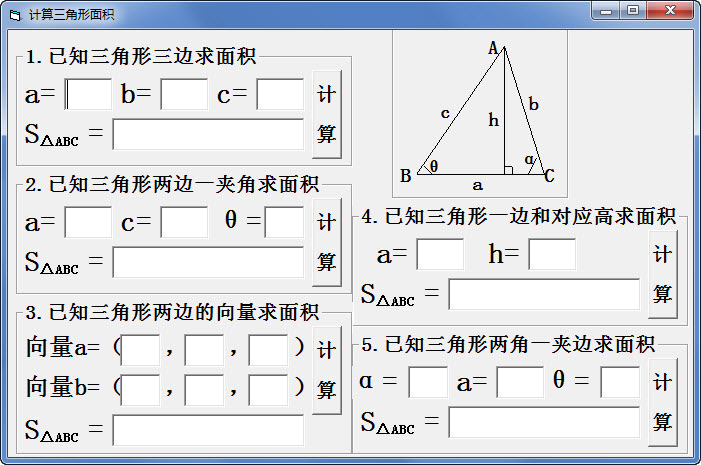 输入三角形三边长度(a、b、c)然后点击“计算”,三角型面积将自动显示在“S”后面的方框中。——用法就是这么简单!