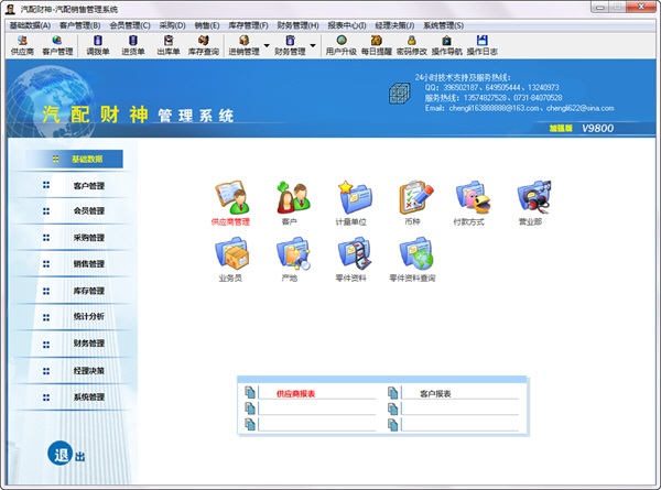汽配财神汽配销售管理系统最新版是一款专为汽配销售公司设计的管理软件。使用本软件可进行供应商管理、客户管理、会员管理、采购管理、销售管理、库存管理、统计分析、财务管理、经理决策以及系统管理。软件的操作十分简单,功能模块齐全,方便了汽配销售公司管理者对公司的管理。