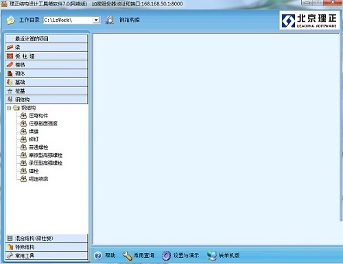 系统采用目录化的构件管理方式,把构件设计工具箱系列软件划分为4种类型:钢筋混凝土结构、砌体结构、地基基础、钢结构。同时列出了最近进行的计算项目,最多可列出最近的14个项目。