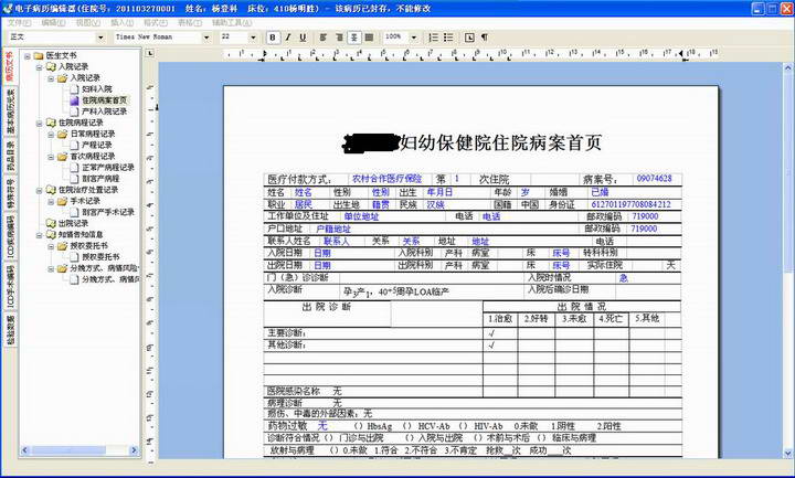 4、住院病历:在病员入院后各种记录根据系统提供模板,可方便、轻松地完成书写。包括入院记录、病程记录、检查记录、手术记录、出院记录、各类通知书、病案首页等全部操作在同一界面完成,可采取新建、编辑、打印一站式完成,也可根据业务流程的不同,用户自行定制多种灵活的模式。