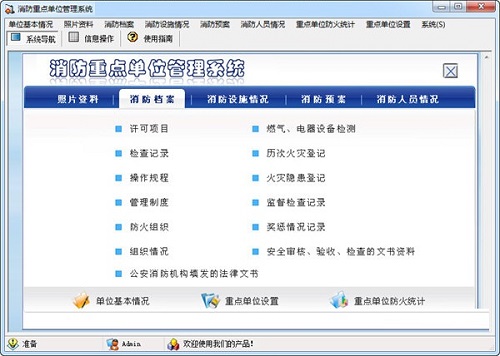 消防重点单位管理系统中文版是一款功能实用的消防安全重点管理工具,消防重点单位管理系统中文版内置丰富的功能,其可以进行消防档案、消防设施、消防预案、消防人员和消防数理统计等内容的全面管理。消防重点单位管理系统还建立了程序化、制度化、规范化的消防安全计算机软件管理系统。