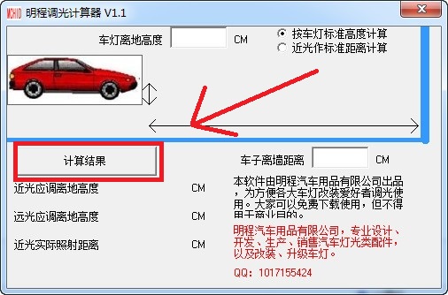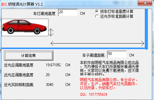明程调光计算器官方版可设置车灯离去高度,按车灯标准高度计算,按近光作标准距离计算,车子离墙距离,计算出近灯应调离高度,远光应调离高度,近光实际照射距离。