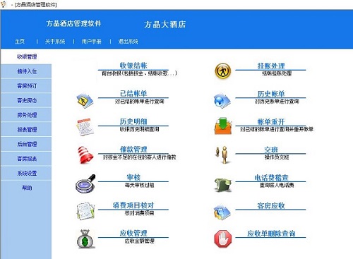 方晶酒店管理系统最新版是一款功能实用的酒店经营管理软件。方晶酒店管理系统最新版包含了收银结账、挂账处理、已结账单、历史账单、历史明细、账单重开、催款管理、交班管理、审核、接待入住、客房预订、房务处理、报表管理等主要功能。方晶酒店管理系统可以随时备份系统中的数据。