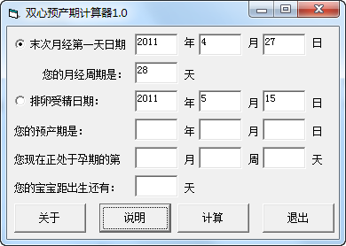 双心预产期计算器官方版是一款十分优秀和出众的计算孕妇预产期的软件,双心预产期计算器官方版专用于计算孕妇产子时间,双心预产期计算器有四种计算产期的方法,分别根据最后一次月经、受精日、子宫大小和B超作为计算依据。使用起来非常的简单,省时省力!