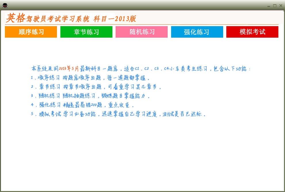 英格驾驶员考试学习系统官方版是一款内容丰富、高端实用的驾驶员考试学习软件,英格驾驶员考试学习系统官方版是驾照考试科目一练习和模拟考试用的软件,它采用2013年5月版公安部最新的题库,小车、客车和货车驾照考试科目一的内容都有。
