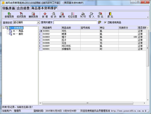 可依需求定义商品分类、商品管理包含有商品编码、商品名称、商品速记码、商品条码、商品规格、兑换积分等信息。