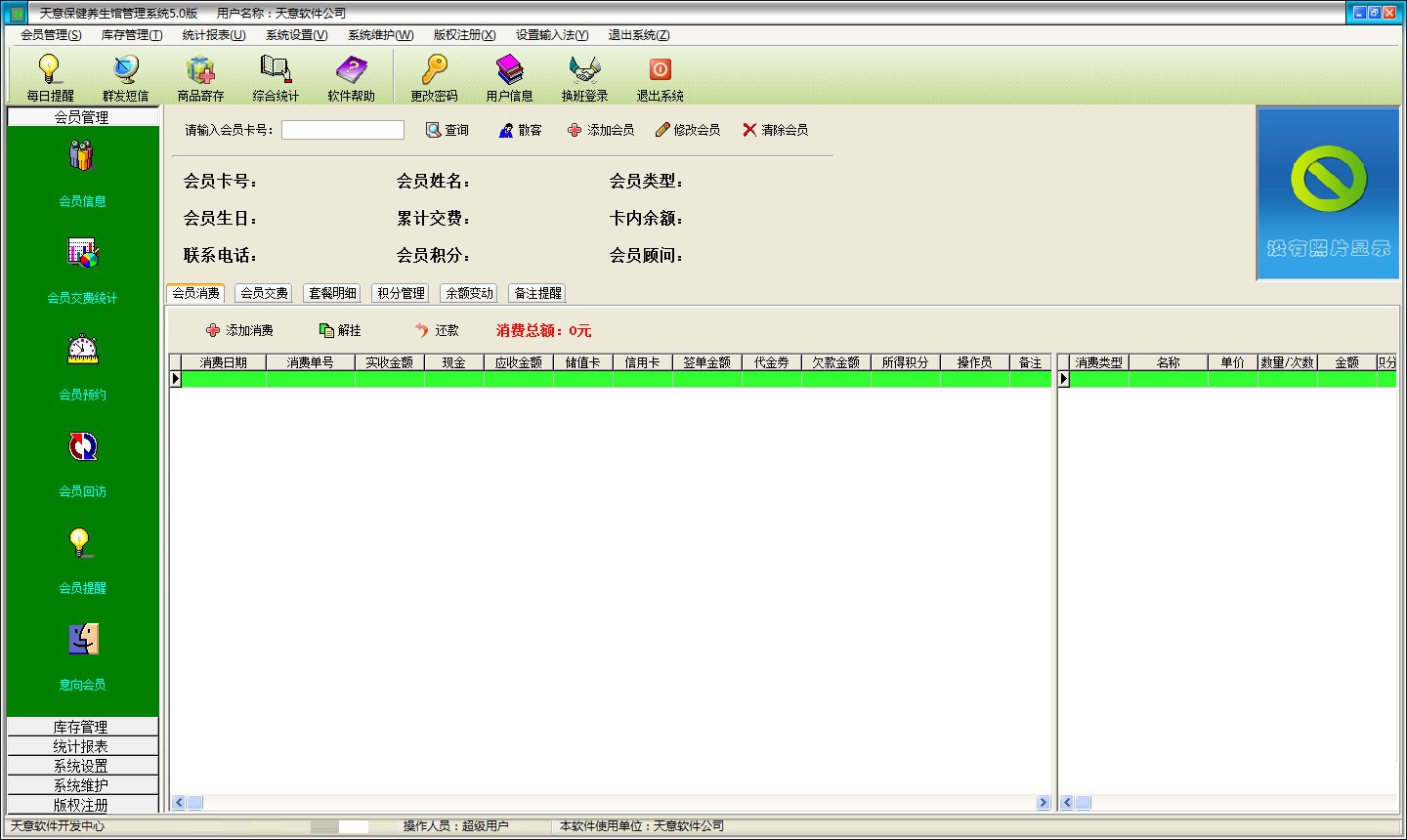 天意保健养生馆管理系统正式版是一款专门为保健、按摩、护理、理疗、养生行业设计的专业管理软件,广泛适用于按摩店、护理机构、养生会所等场合,天意保健养生馆管理系统具有强大的会员管理、套餐管理、员工管理等功能,方便的票据打印,简洁实用的库存管理,带有客户回访功能,能计算员工每月提成金额,详细完备的统计报表,让保健养生机构经营者轻松管理,明白算账。