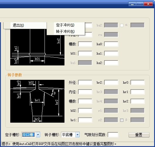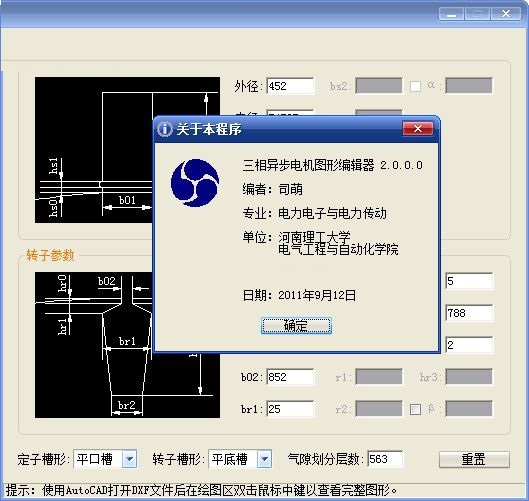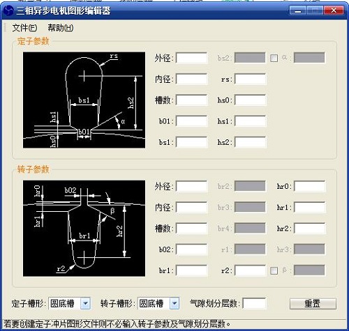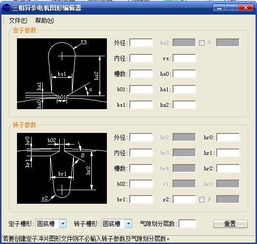 三相异步电机图形编辑器最新版是一款操作简单的电机图形编辑工具。三相异步电机图形编辑器正式版提供给用户进行操作使用,也无需进行安装,点击软件图标即可进入主界面,进行参数的输入,这进行图纸的选择,即可快速的得到根据参数产生的图纸。三相异步电机图形编辑器还支持多种定子槽形和转子槽形,生成的DXF格式通用图形文件。