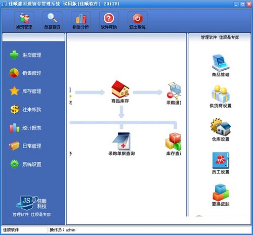 佳顺建材进销存管理系统最新版是一款功能实用的五金建材销售管理软件,佳顺建材进销存最新版可适用于五金、建材等相关门店、公司、企业的五金建材销售管理、库存管理、企业内部财务及人事管理。佳顺建材进销存管理系统操作起来十分简单,无需专业知识,就能上手。