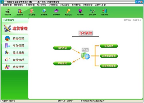 天意会员销售管理系统官方版支持进货管理:进行商品采购入库,采购退货,进/退单据和当前库存查询,与供货商的往来帐务。