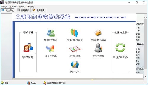 电话顾问咨询管理系统官方版是一款十分受欢迎且高端实用的电话顾问咨询管理工具,电话顾问咨询管理系统官方版可以为电话客服提供方便快捷的办公辅助功能,电话顾问咨询管理系统拥有批量转业务功能,省心又省力!