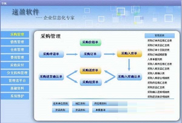 4、速盈进销存管理软件官方版支持采购管理:采购管理包含采购价格单、采购申请单、采购订单、采购入库单、采购入库确认单、采购退货确认单、采购退库单、采购结算单等功能单据。