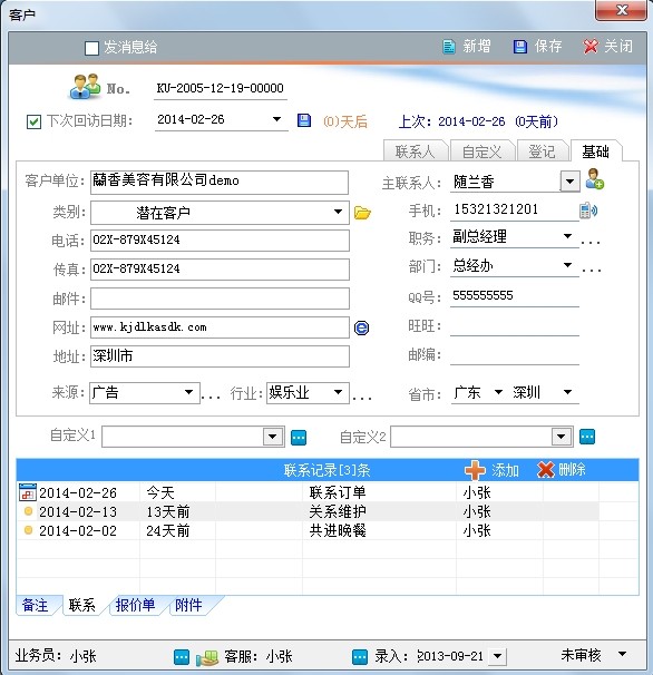客户单位信息,联系人信息记录,查询;超期未联系客户提醒,支持导入、导出Excel。