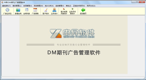中异DM期刊广告管理软件正式版是款实用性能稳定且专业应用于广告管理,中异DM期刊广告管理软件正式版拥有丰富的功能,其软件可以进行基础资料管理、媒体管理、合同管理、广告排期、财务管理以及常用报表统计等功能模块的操作,非常的方便便捷。