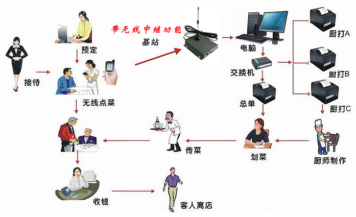 无线点菜器的基本功能是开台、点菜、加菜、退菜、催菜、查询等;单一点菜机可同时服务任意个餐台;可以支持点菜器和基站多对多工作。