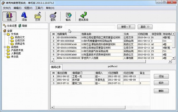 档案文件借阅管理,包含借阅人、借阅时间、归还日期及归还期限提醒等功能;