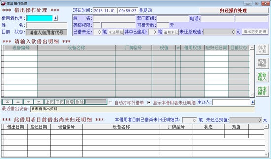 设备仪器借还系统官方版主要是针对事业单位所打造的固定资产以及仪器借还管理工具。设备仪器借还系统官方版使用的时候只需要输入借出者信息就可以了,而且会保存借出者的档案,方便下次再次进行接触。数据的查询也非常方便,更可以将数据导入导出到excel等软件并且打印出来,让你的管理更加方便,快捷。