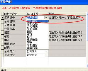 Excel导入客户资料,操作时,选中“Excel字段”栏中的字段,再单击选中字段便会弹出下拉选择框,再选择字段,确保“源自段”和“Excel中的字段”一一对应。若两边字段不同,请确保右边“Excel字段”一边为空,否则会出现错误。
