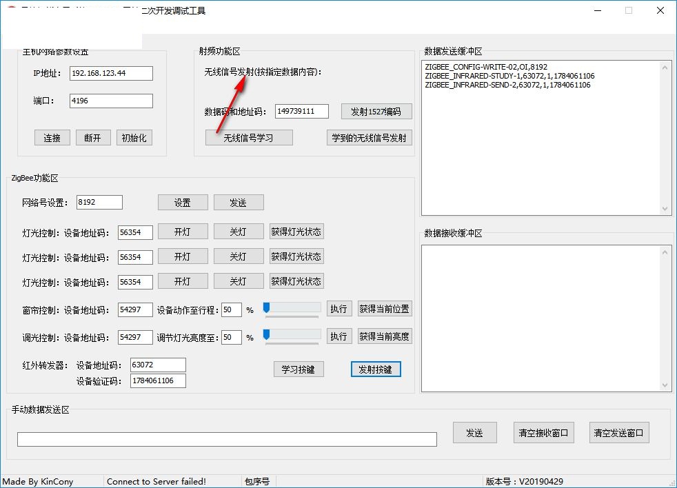 4、红外转发器:设备地址码:63072,设备验证码:1784061106,点击学习按键就可以在数据发送缓存区显示