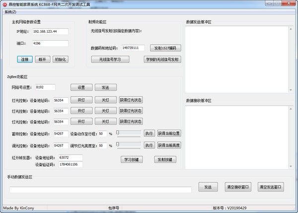 1、打开KC868-F-Test.exe软件,这里是软件的主界面,可以对主机网络参数设置,输入主机地址和端口