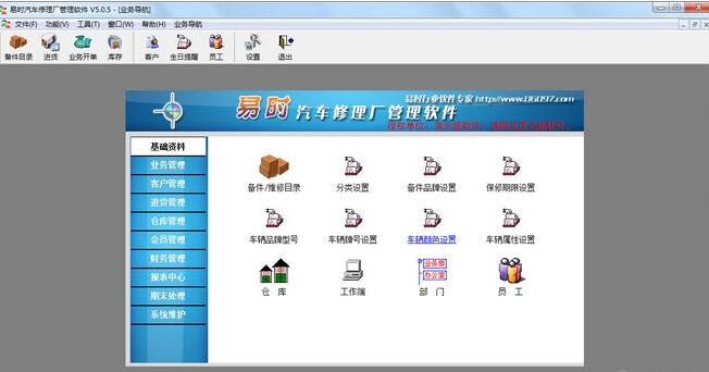 基础资料包括“商品目录”、“分类设置”、“品牌设置”、“保修期限设置”、“车辆属性设置”、“仓库”、“工作端”、“部门”、“员工”等几个模块。用户可以在此预设店内的所有基础信息,如员工、商品资料等,便于在以后的进货销售等更方便的查找、调入。
