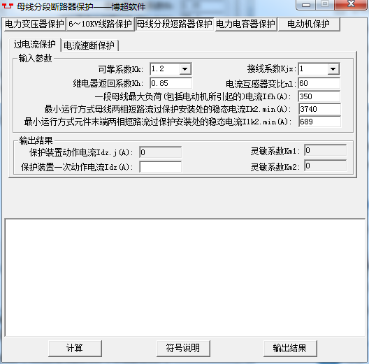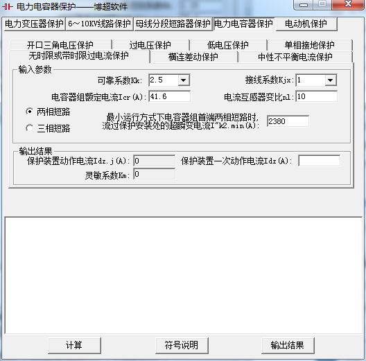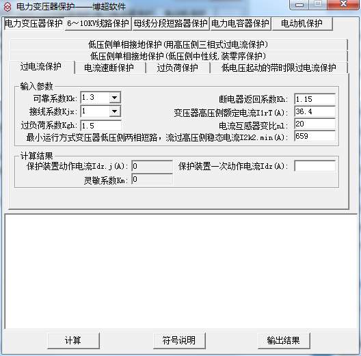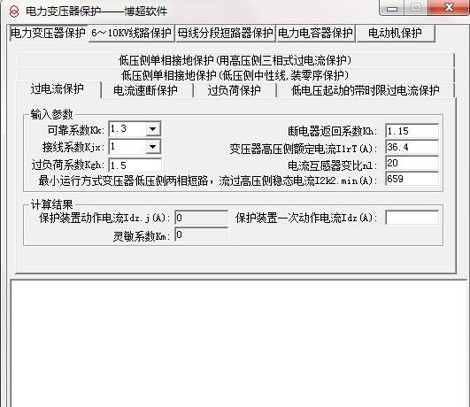 博超电力变压器保护最新版是款界面简洁友好且操作极其简单的电力计算的变压器保护工具,博超电力变压器保护最新版采用严谨的设计理念且还包含电力电压器保护、6-10KV线路保护、母线分段短路器保护、电力电容器保护、电动机保护、过电流保护、过负荷保护、电流速断保护等功能,用户输入对应参数就可计算保护装置动作电流了。