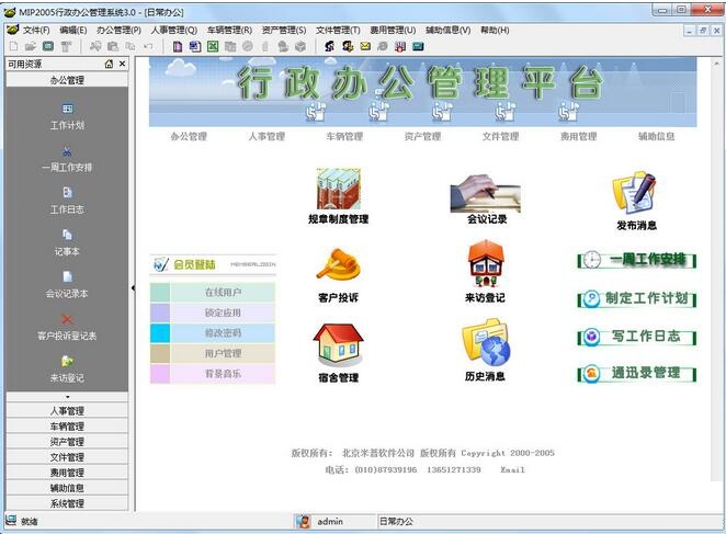 4、办公管理:工作计划,一周工作安排,工作日志,记事本,会议记录本,客户投诉登记表,来访登记,往来信函管理,宿舍管理,出差管理;