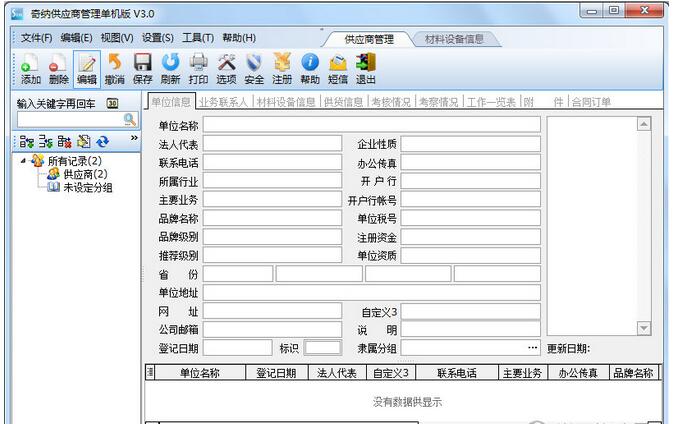 奇纳供应商管理介绍是一款具有时尚、美观、易用、功能强大的供应商关系管理软件。它是您不可缺少的助手,为您的工作带来极大地便利。作为一款专业的信息管理软件,它拥有很多功能。例如:树型结构显示、表格显示、快速的查找功能、详细的信息显示、名片显示等等。有了它,您就可以系统化的管理您的供应商。供应商关系管理