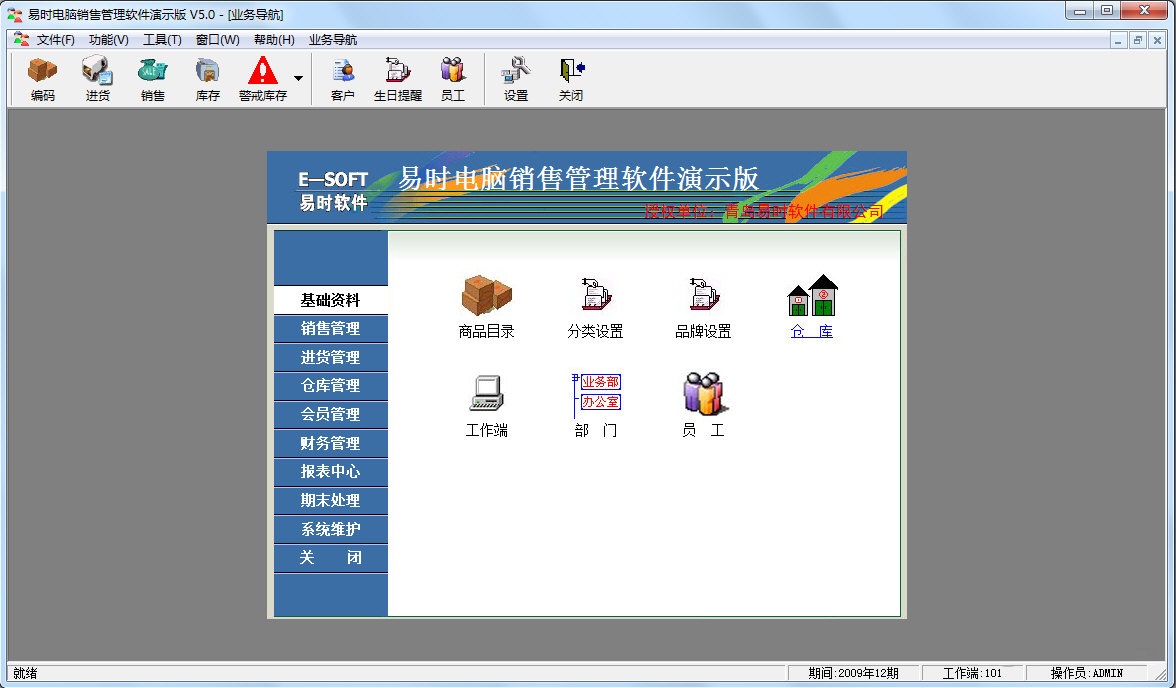 基础资料包括“商品目录”、“分类设置”、“品牌设置”、“仓库”、“工作端”、“部门”、“员工”几个模块。可以在此预设店内的所有基础信息,如员工,商品资料等,便于在以后的进货销售等更方便的查找、调入。