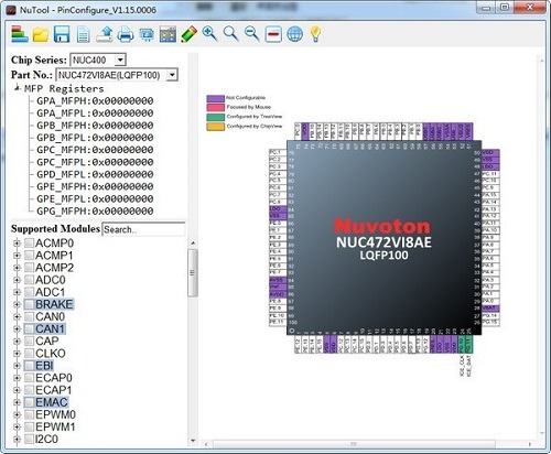 NuTool-PinConfigure最新版是很具专业性而且功能也比较实用的设计脚位配置辅助软件,NuTool-PinConfigure电脑版能够提供开发初期选择通用管脚(GPIO)功能的规划工具,伴随以太网,emWin图形库等功能在M4微控制器体系的加入,芯片管脚的应用数量已经较大,只看手册进行设计的话,硬件设计繁琐。软件具备多功能管脚的本地配置,适用于所有NuMicro家族单片机。