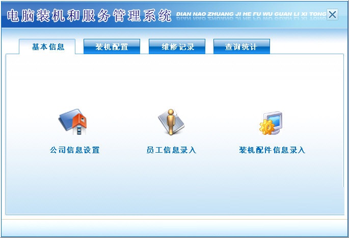 1、本信息:装机配件信息录入、员工信息录入和公司信息设置。