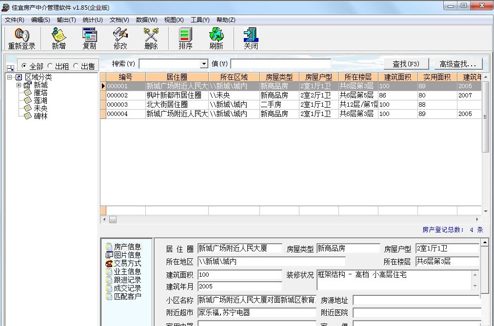 佳宜房产中介管理软件最新版将各种地域的房产信息详细记录,佳宜房产中介管理软件最新版可以让用户多方面了解房产信息。软件提供了出租、业售、求租、求购、自动匹配及房屋图片、房屋文件模块的管理。让用户有一种多种选择体验。